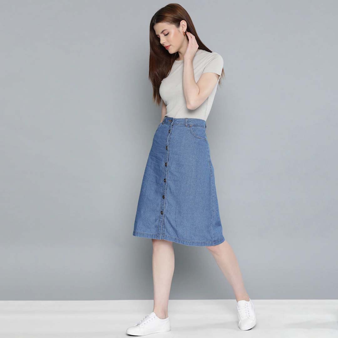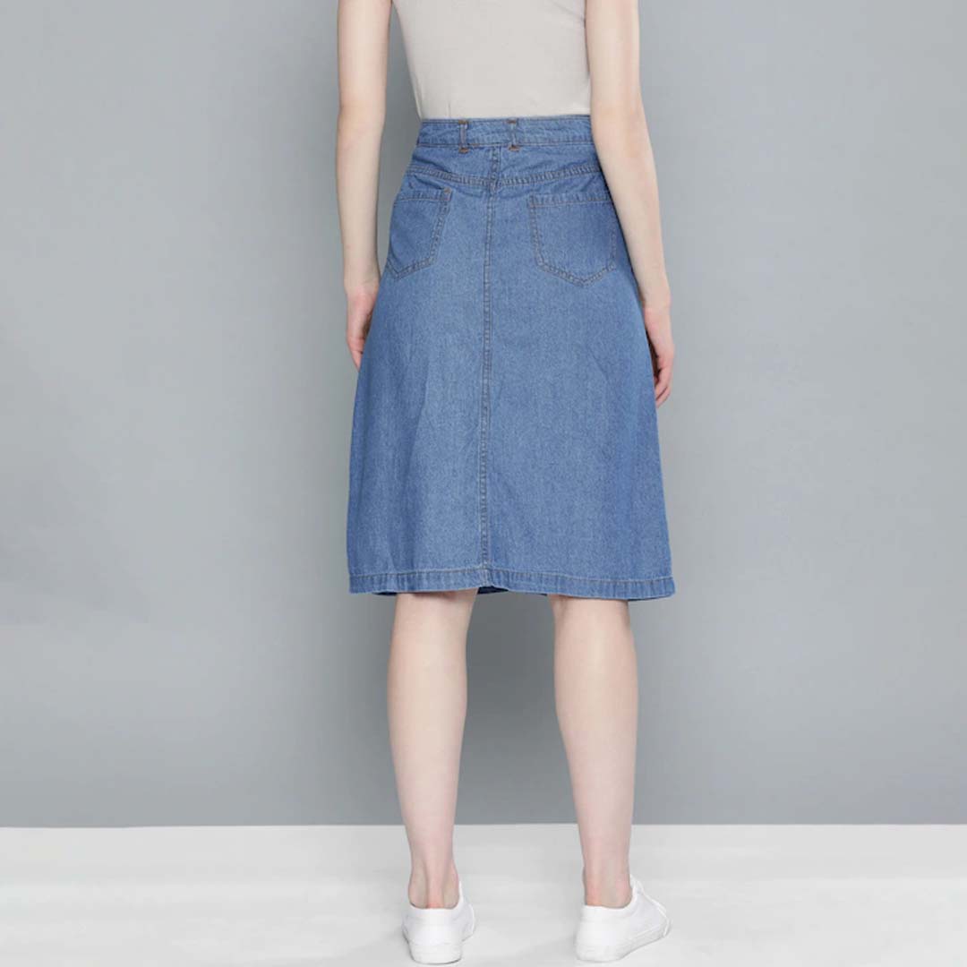Blue solid denim skirt, has an elasticated waistband with a button closure, straight hem