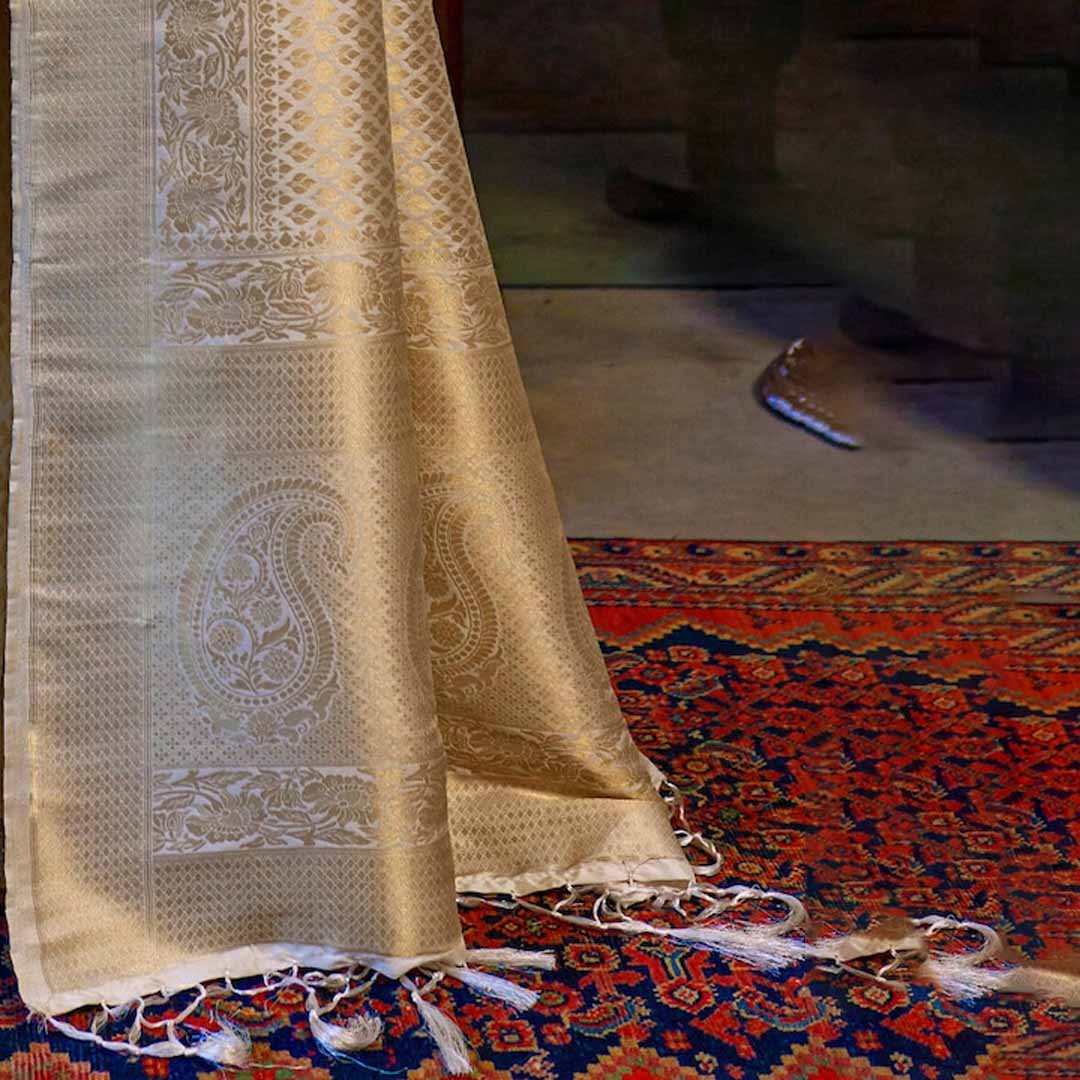 Cream-coloured and gold-toned kanjeevaram saree Ethnic motifs woven design saree with zari border Has zari detail