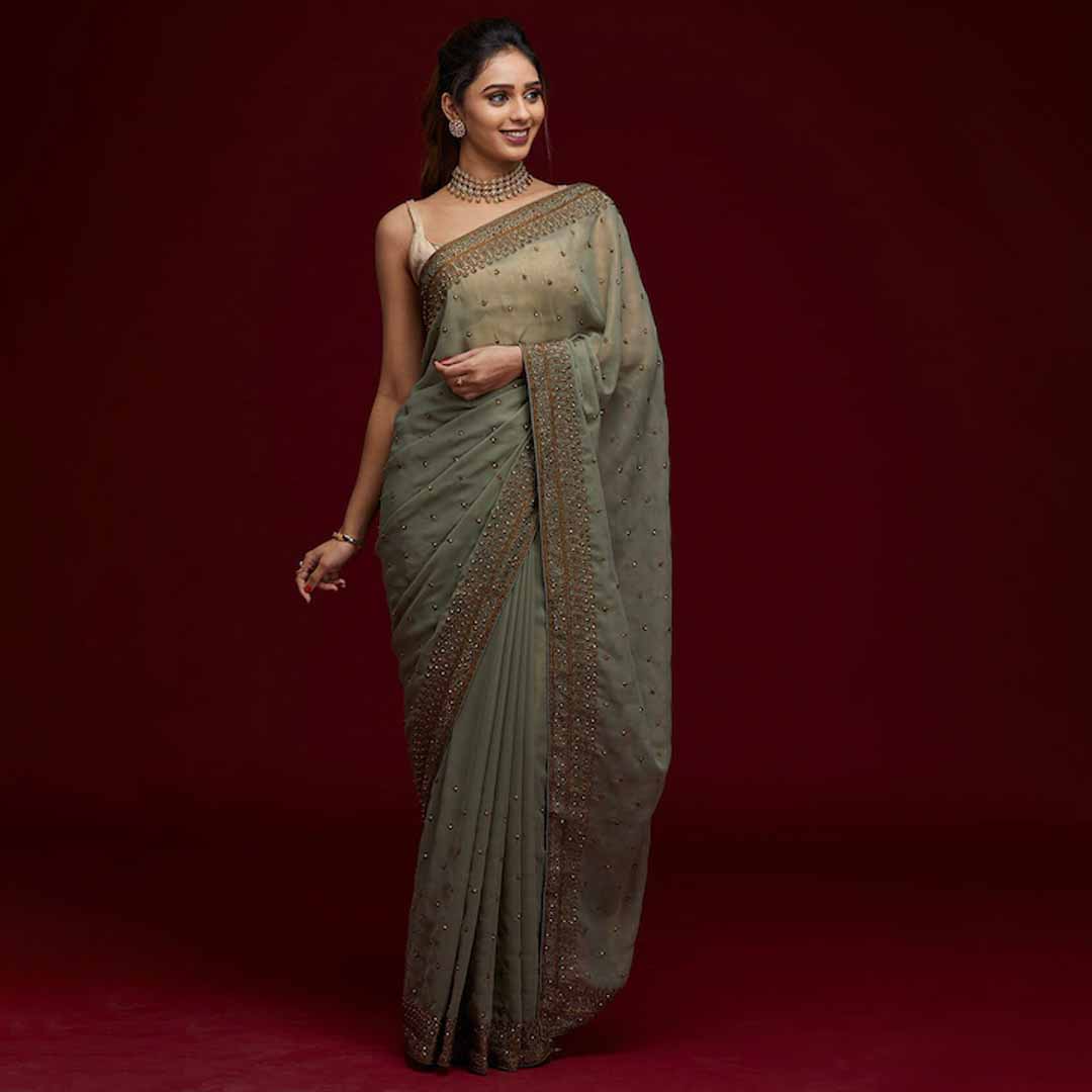 Design Details Green and gold-toned saree Floral embroidered saree with embroidered border Has embroidered detail