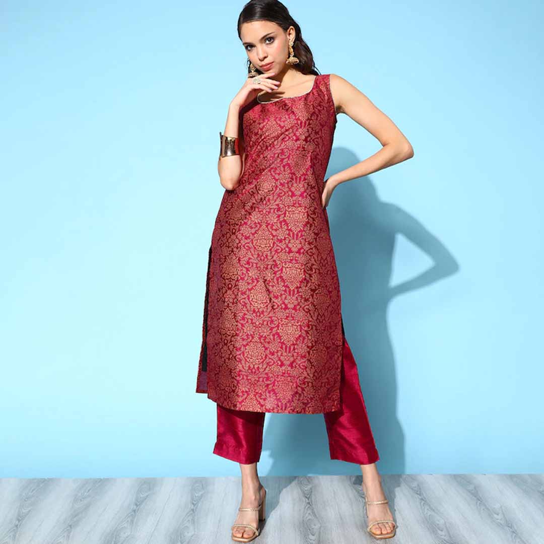 Add a touch of style to your ethnic wear closet with this smart and fashionable kurta set. It comes with a round neck and charming calf length for an elevated appeal. Kurta: Burgundy tone Round neck Sleeveless Calf length Poly silk, hand wash Trousers: Solid trousers Partially elasticated waist Poly silk, hand wash