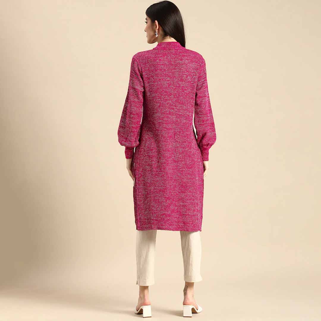 Colour: magenta Floral embroidered Round neck Long, puff sleeves A-line shape with regular style Knee length with straight hem Machine weave regular woollen