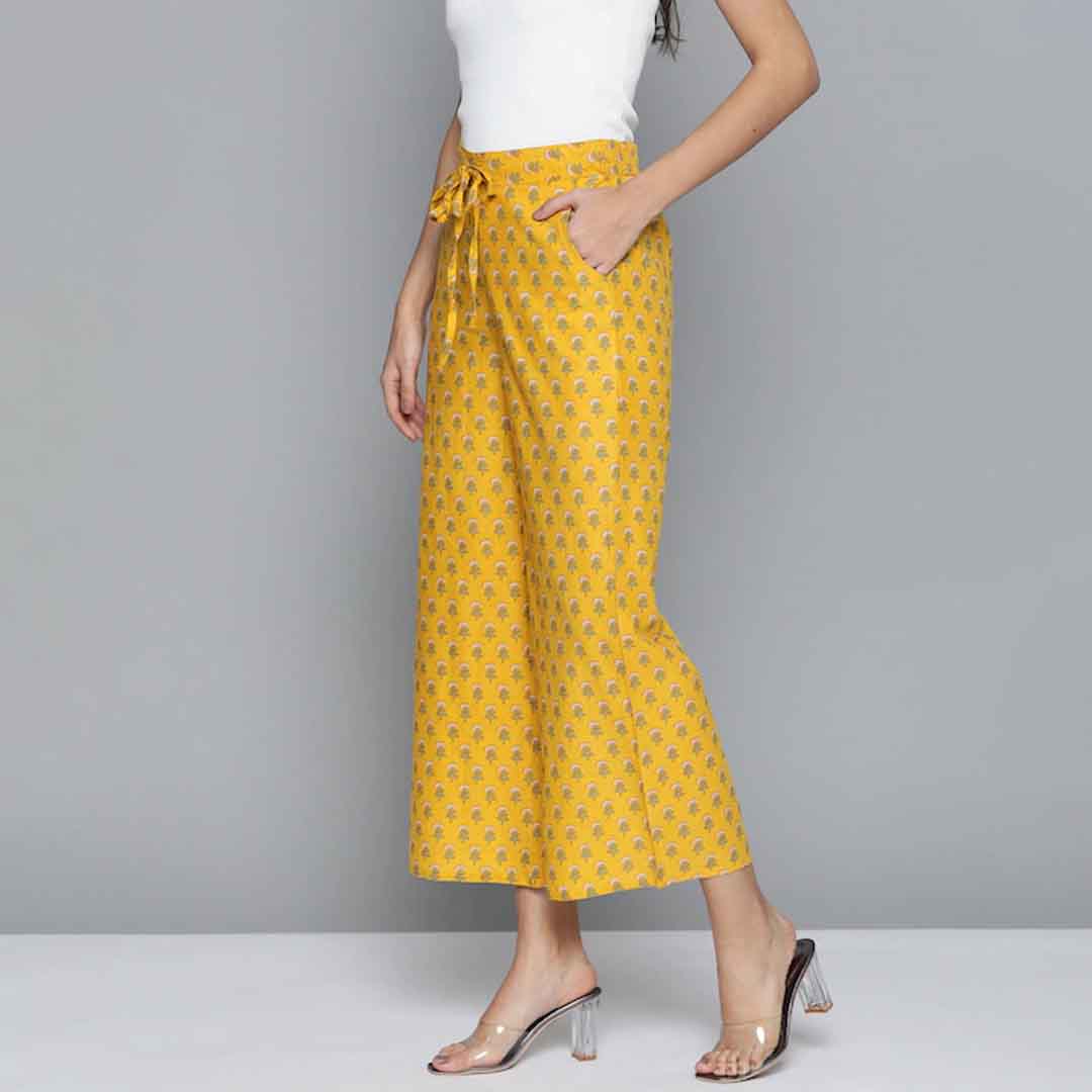 Yellow and off-white ethnic print wide leg cropped palazzos