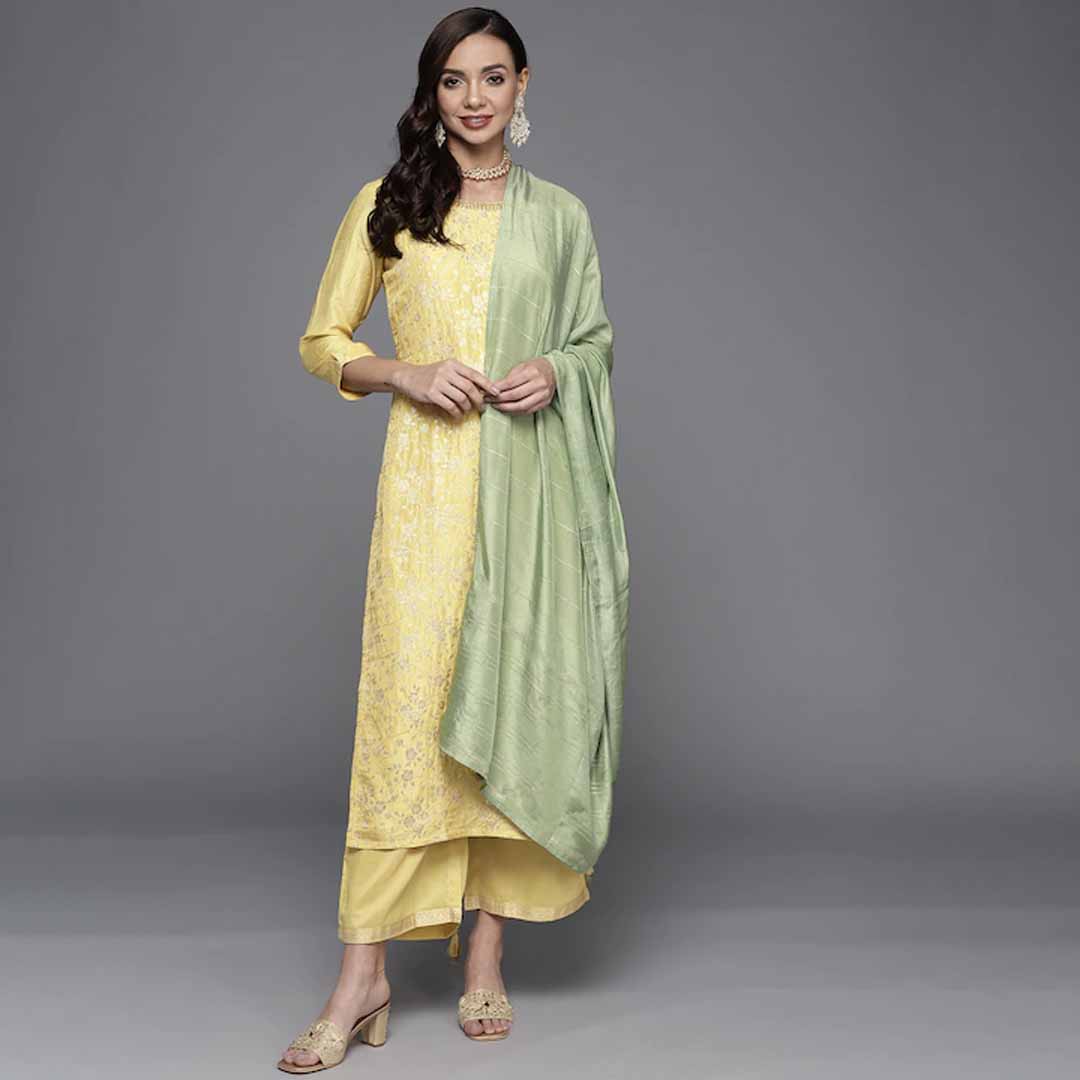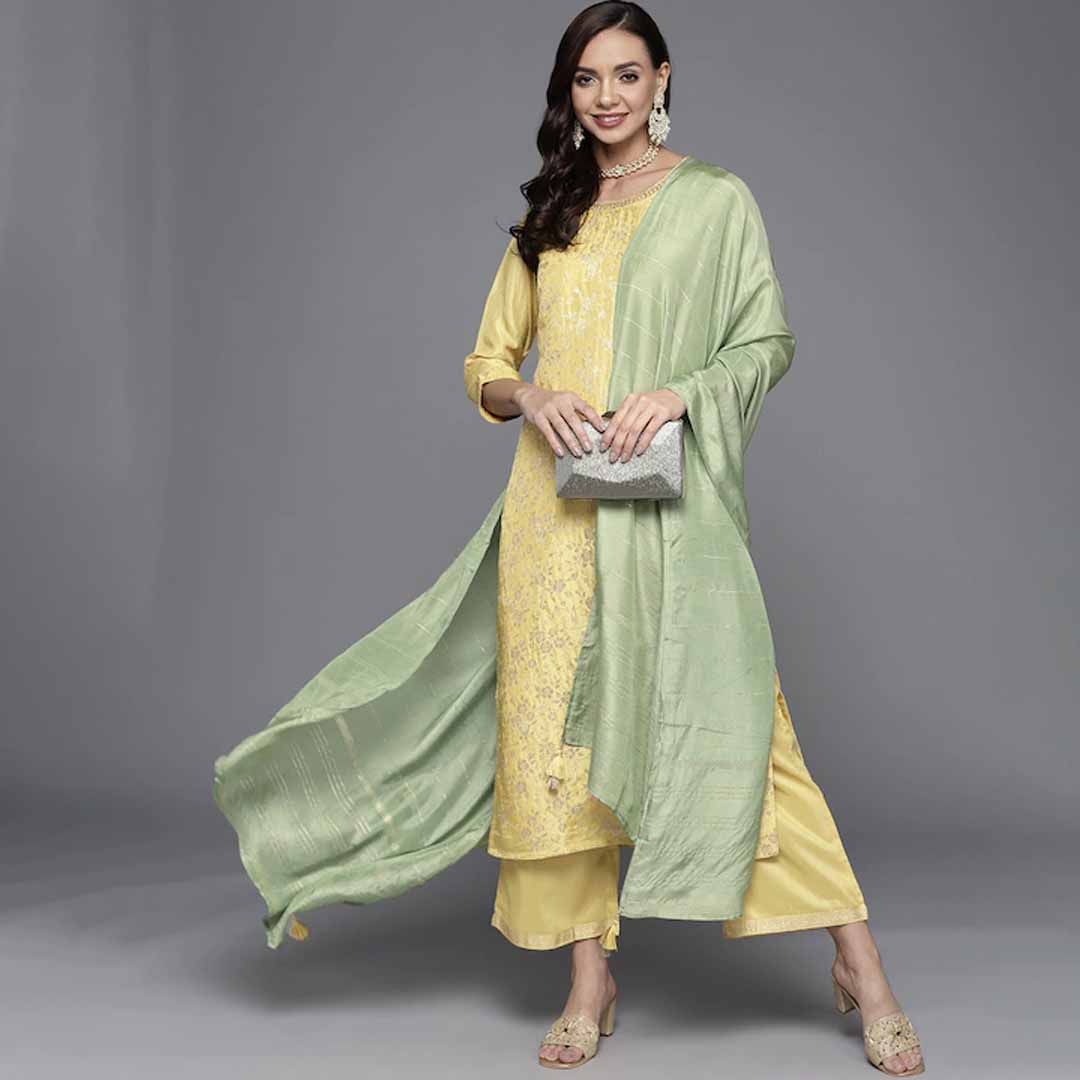 Yellow woven design Kurta with Palazzos with dupatta Kurta design: Woven design woven design Straight shape Regular style Round neck, three-quarter roll-up sleeves Zari detail Calf length with straight hem Silk blend knitted and woven fabric Palazzos design: Solid Palazzos Elasticated waistband Slip-on closure