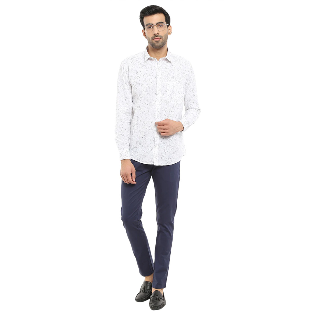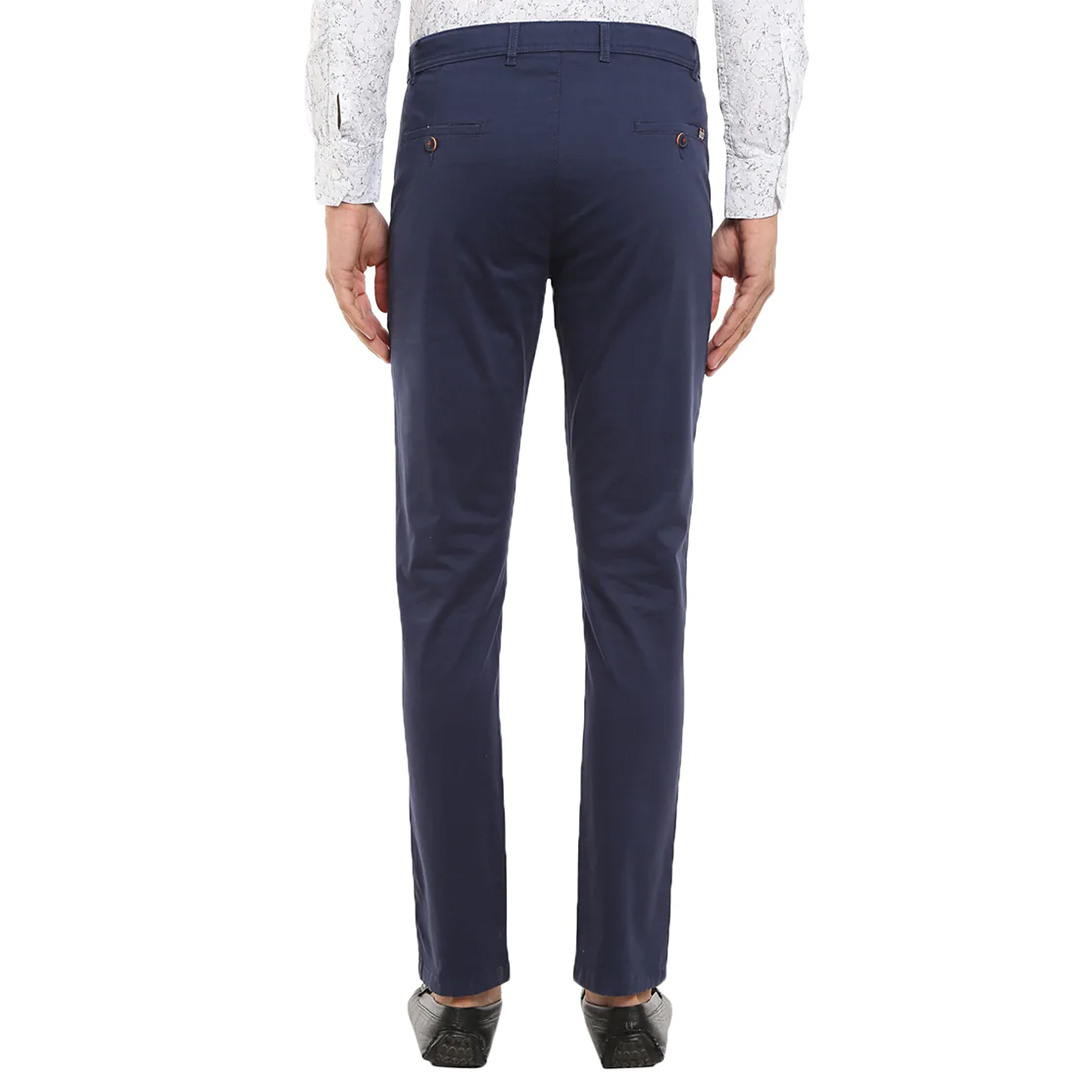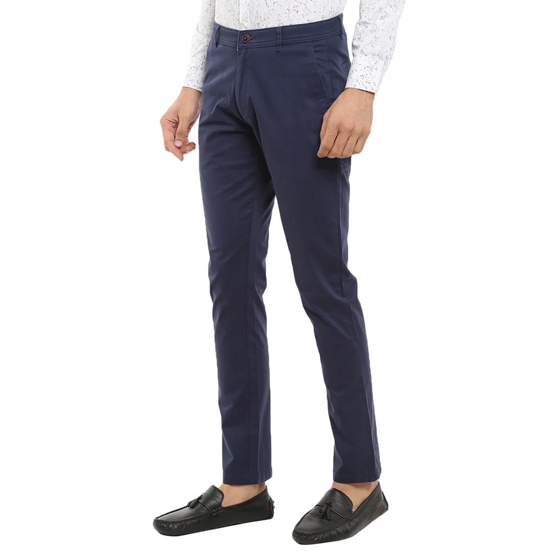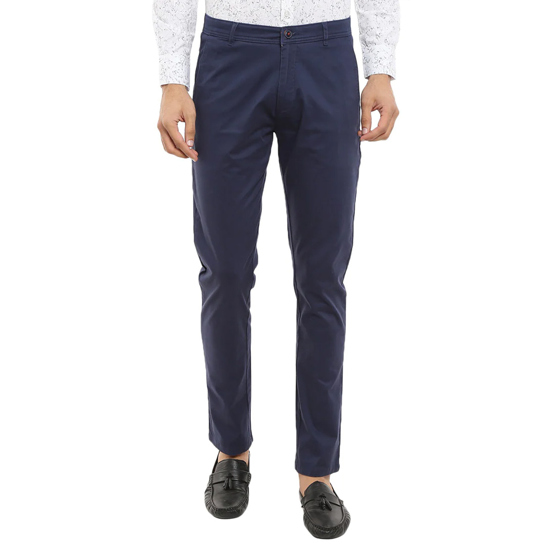 look dapper by adding this slim fit solid navy cotton trouser for men. tailored to fit, these casual trousers have been crafted from twill fabric to give you all-day comfort. regular length chinos with bone pocket can be paired with a casual shirt and sneakers or a boot to complete the look.
