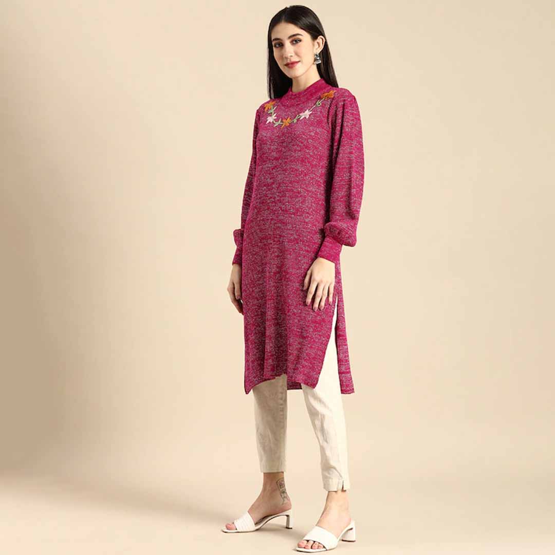 Colour: magenta Floral embroidered Round neck Long, puff sleeves A-line shape with regular style Knee length with straight hem Machine weave regular woollen