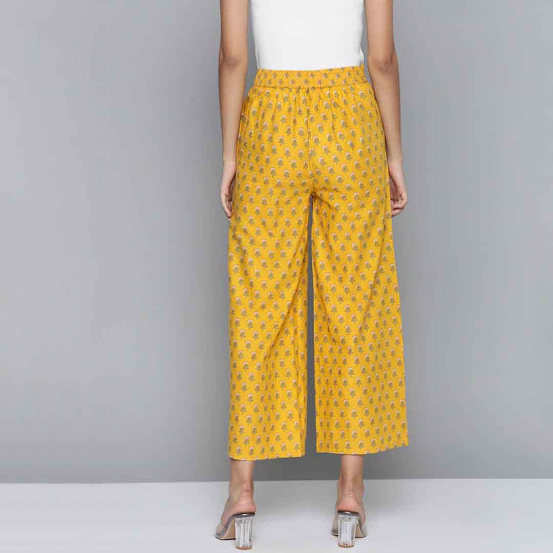 Yellow and off-white ethnic print wide leg cropped palazzos