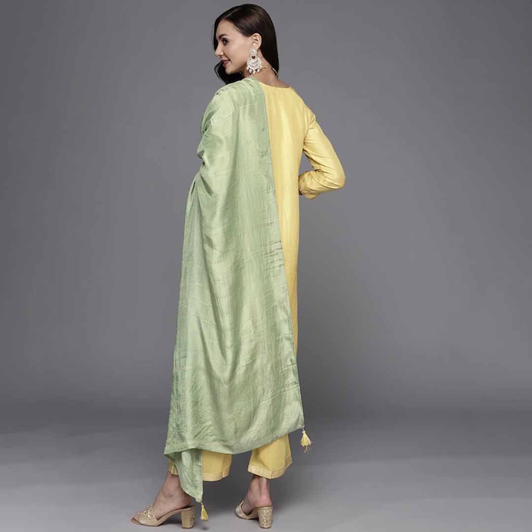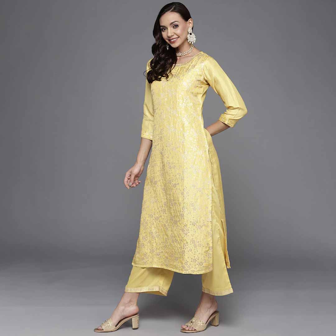 Yellow woven design Kurta with Palazzos with dupatta Kurta design: Woven design woven design Straight shape Regular style Round neck, three-quarter roll-up sleeves Zari detail Calf length with straight hem Silk blend knitted and woven fabric Palazzos design: Solid Palazzos Elasticated waistband Slip-on closure